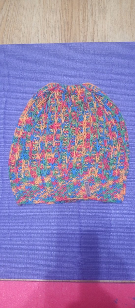 Renkli ve örgü yapılı bu kadın bere, bohem ve retro tarzıyla sıcak ve rahat bir görünüm sunar.