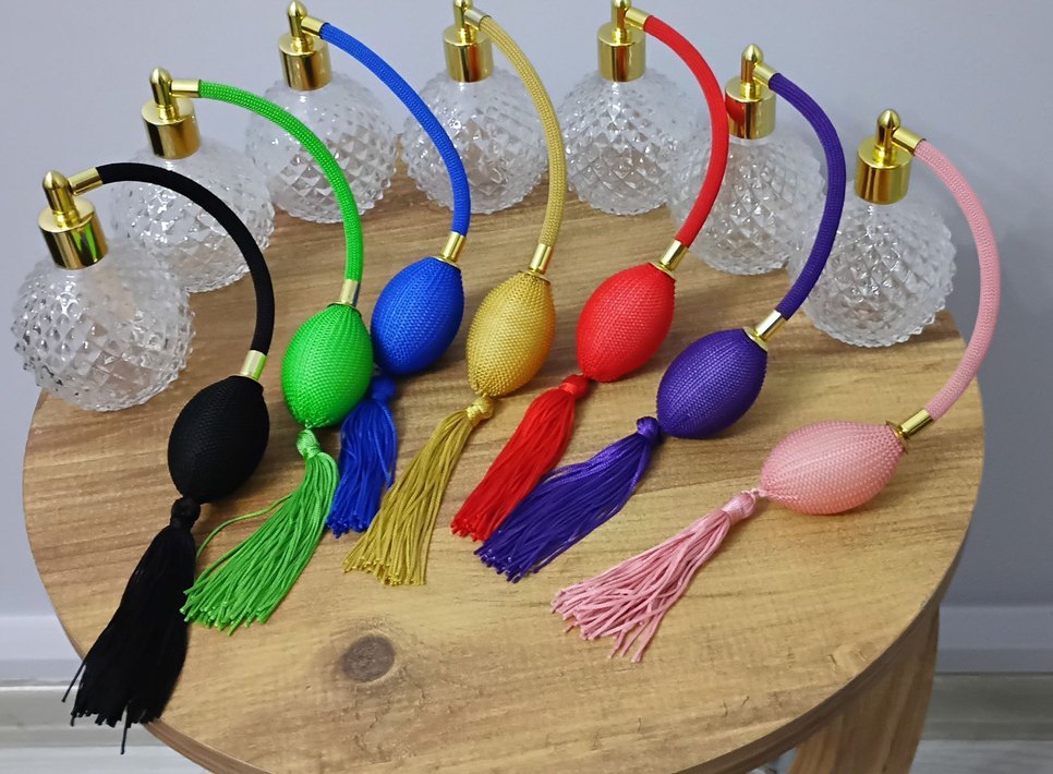 Çeşitli renkte püsküllü, vintage tarzda kadın parfüm şişesi pompası, zarif koku uygulaması için uygun.
