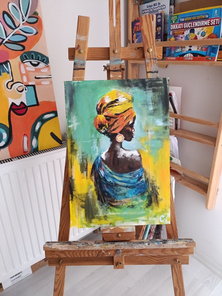Bu tablo, canlı renklerde sarılmış başörtüsü ve giysileriyle bir kadının koyu tonlu portresini içerir.