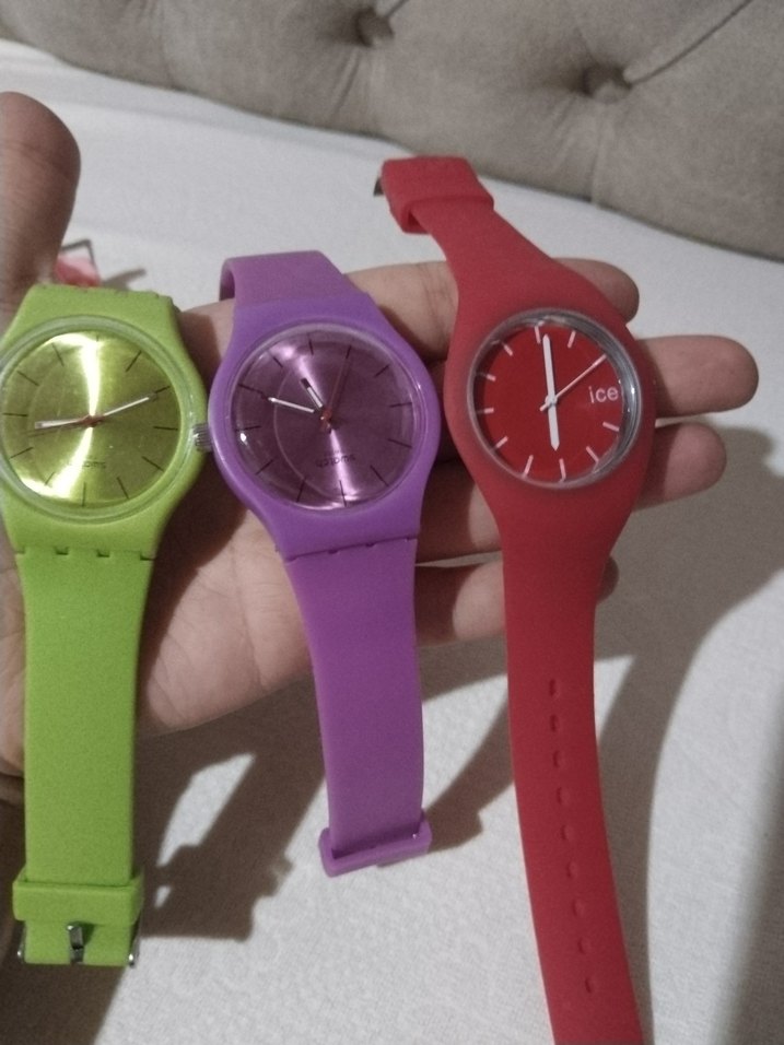 Renkli kadın saatleri, tokalı silikon kayışlı, minimal tasarımlı ve canlı renklerde yeşil, mor ve kırmızı kadranlı. ⌚Sadece pilleri bitmiştir
