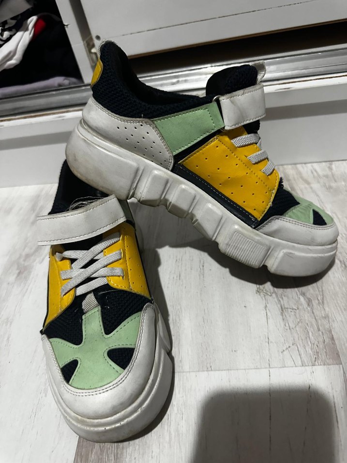 Renkli baskılı tasarıma sahip kadın spor ayakkabısı, blok topuklu ve kauçuk tabanlıdır. Ayarlanabilir Velcro bantlar içerir, spor ve günlük kullanıma uygundur.