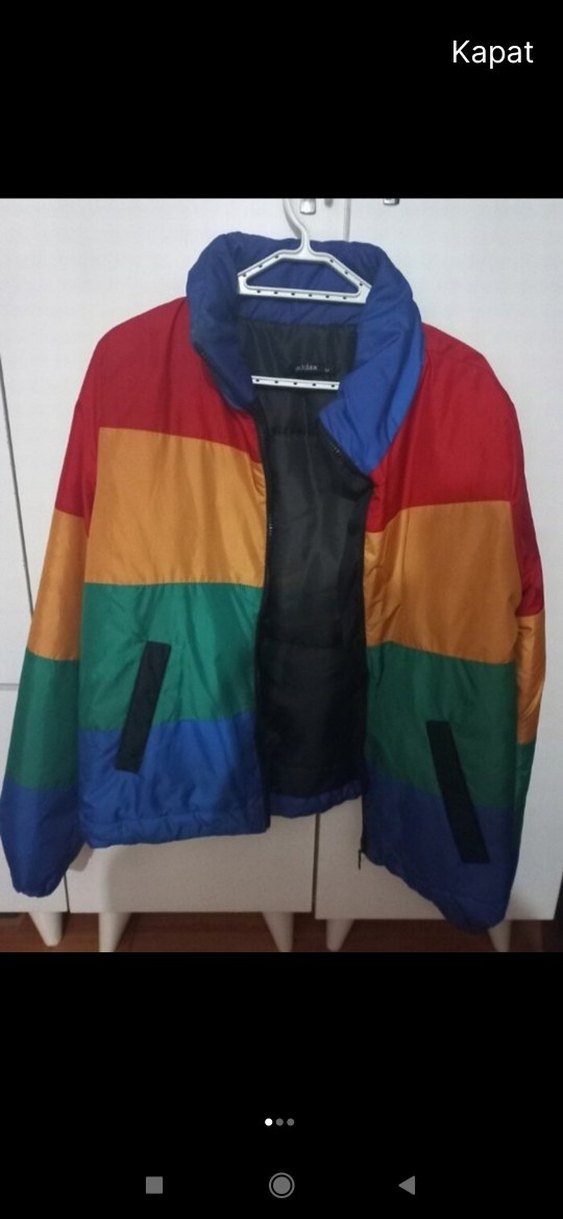 Uzun kollu, yüksek yakalı ve fermuarlı çok renkli kadın montu, rahat kesimiyle dış mekan kullanımı için uygundur. 2 kez kullanıldı yepyeni