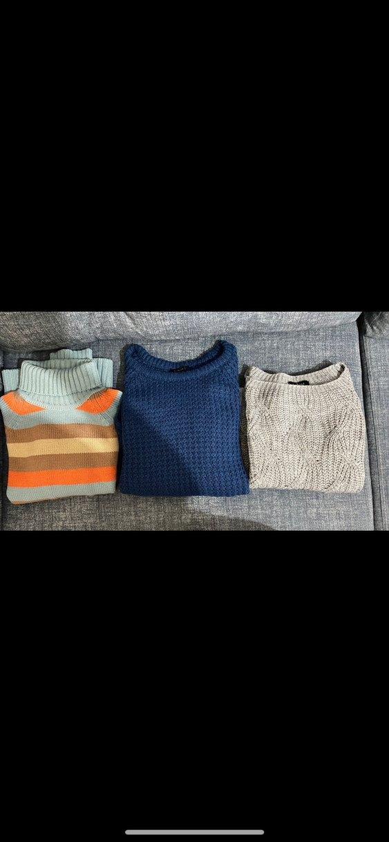 Bu mavi kadın triko kazak, uzun kollu ve yuvarlak yakalıdır. Rahat kesimi ve kalçayı kapatan boyuyla günlük kullanım için uygundur. Biraz dar kesimdir etikette L yazıyor ama xs s bedene olur. Gri kazak da yuvarlak yaka boyu bel hizasındadır ama crop değildir. Beden olarak salaş bir model. Renkli boğazlı triko kazak boyu kalça yarısına gelecek hizadadır. Beden olarak xs s bedene olur vücüda oturur. Hiçbirinde tüylenme yıpranma vs yoktur. 163 boy 50-58 kilo aralarında kullandım. İlan 3 kazak için geçerlidir.