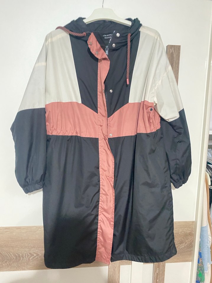 Kadınlar için uzun boy, bol kesim ve düğmeli ön kısmı olan, çok renkli tasarımlı sentetik kumaştan yapılmış yağmurluk.Astarlı yağmurluk çok iyi durumda
