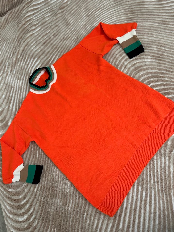 Renkli, uzun kollu ve bisiklet yakalı kadın kazak. Çok renkli ribanalı manşet ve etek ucu, gevşek kesim ve uzun boy. Yumuşak, sıcak örme kumaştan, günlük kullanıma uygundur.
