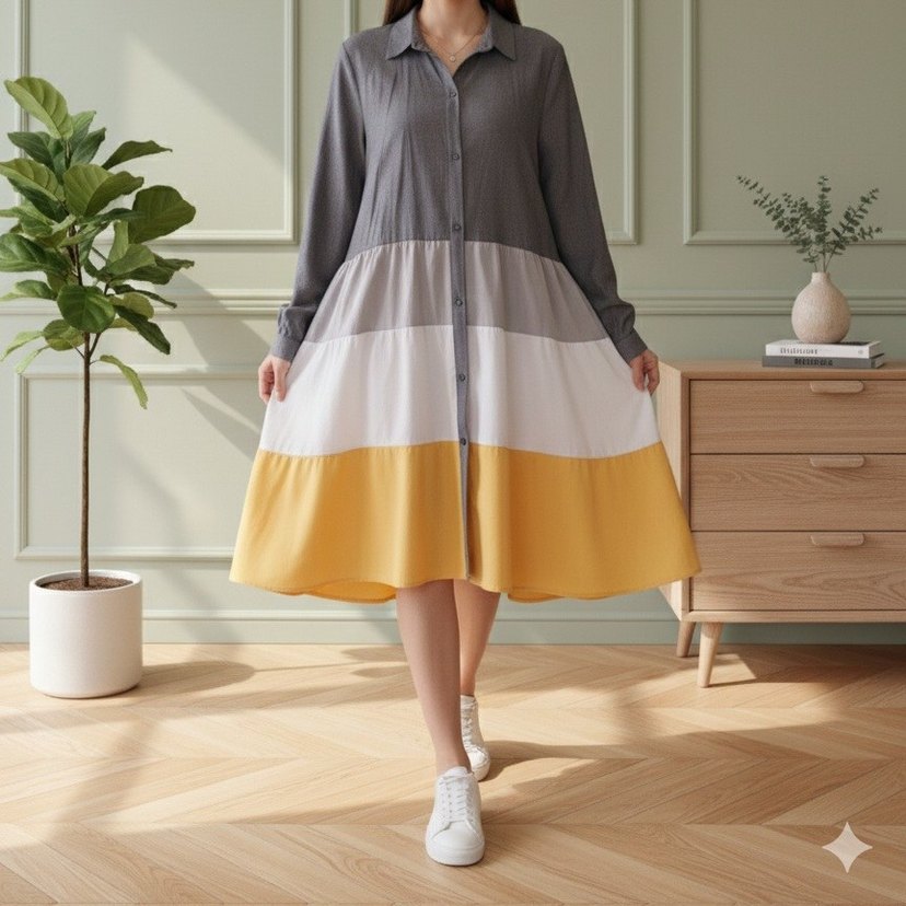 Uzun kollu, bol kesim kadın elbisesi, günlük rahat kullanıma uygun renk bloklu tasarım. 38/40 bedene uyumludur .boy 83 cm