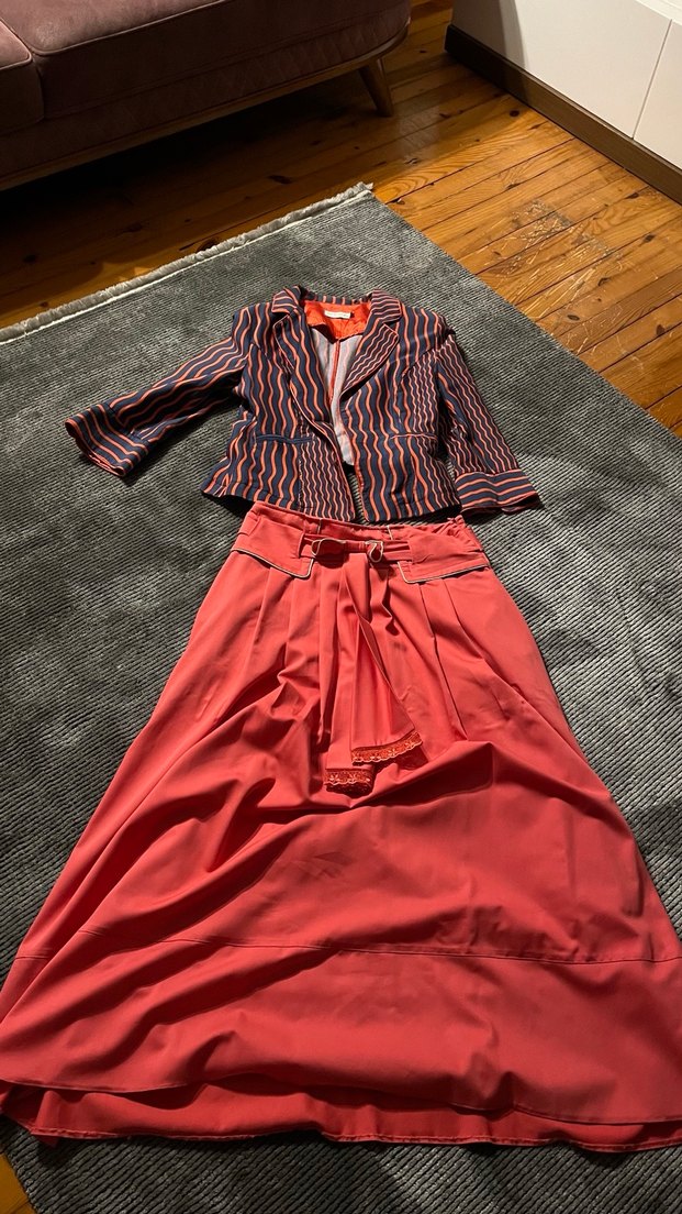 Renkli, pilili uzun etek ve notlu yaka, bol kesim ceket içeren kadın takımı. Sentetik kumaştan, sokak modası ve Paris tarzını yansıtıyor. Uzun kolludur.