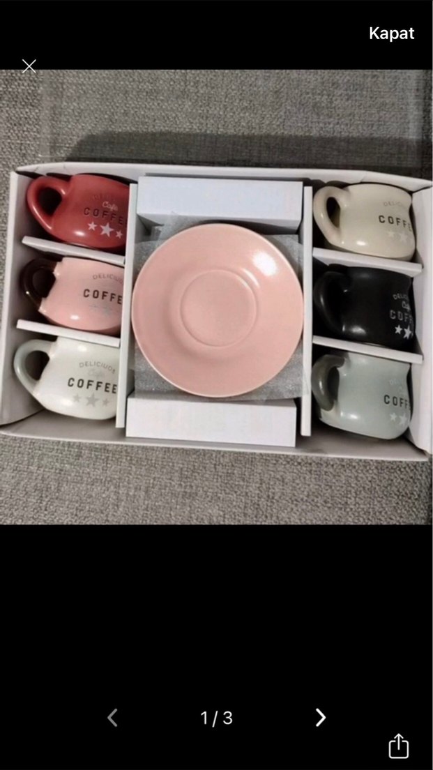 Kahve temalı yazılarla süslenmiş, açık pembe ve pastel tonlarda renkli kahve fincanları ve uyumlu tabak seti. ☕