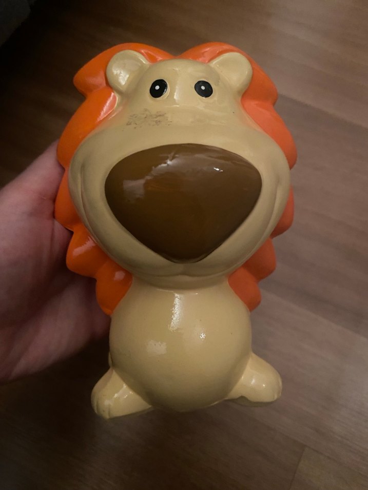 Büyük kahverengi burunlu, parlak turuncu yeleli renkli aslan figürü. Pürüzsüz malzemeden yapılmış ve eğlenceli tasarıma sahip.