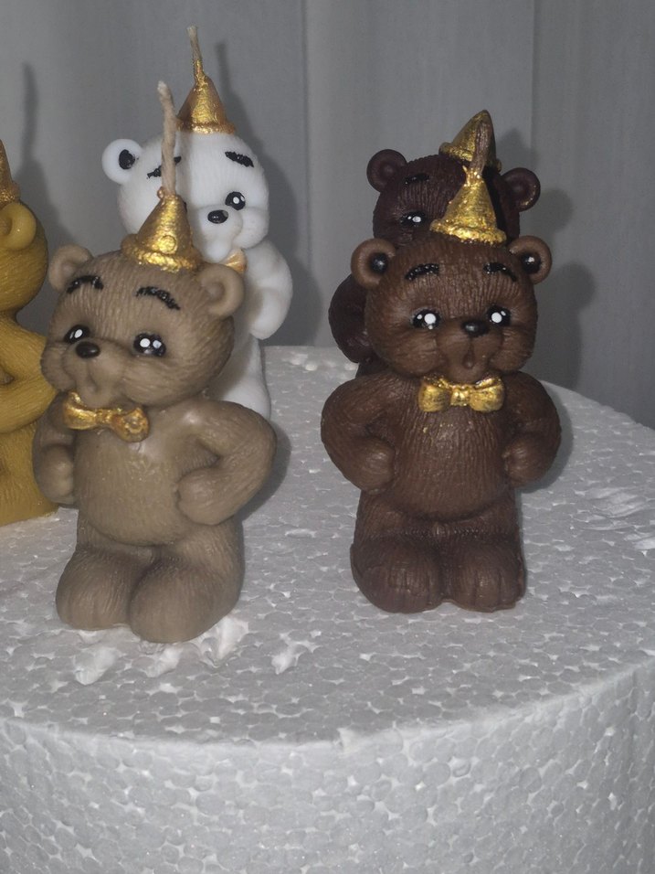 Kahverengi ayı figürlü mumlar, detaylı yüz ifadeleri ve altın renkli parti şapkası ile renkli ve dekoratif bir ürün. ️8 cm boyunda soyawax veya balmumu seçenekleri mevcut.#soyawax #balmumu #ayıcıkmum #pastasüsü #mumüfleyenayıcık #doğumgünü #mumfigür #ayıcıkfigür #mumayıcık