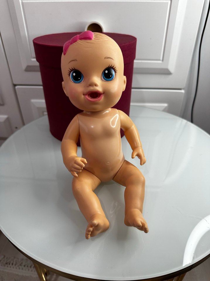 Büyük mavi gözlü, başında pembe kurdele olan renkli kahverengi bebek. Canlı ve gülümseyen yüz ifadesiyle dikkat çekiyor.