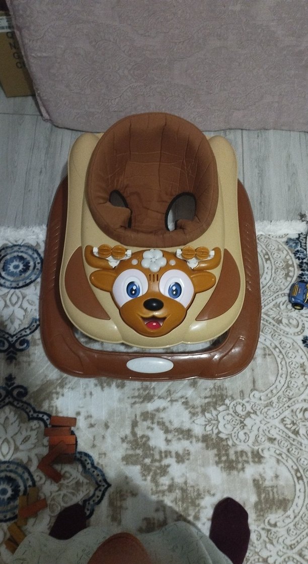 Renkli kahverengi oturaklı ve önünde geyik figürlü bebek yürüteci, erken yürüyüş için destek sağlar.geri iade yoktur