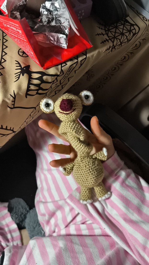 Renkli, kahverengi el yapımı peluş oyuncak, büyük gözler ve yuvarlak burunlu tığ işi tasarıma sahiptir. Yumuşak ve hafiftir.