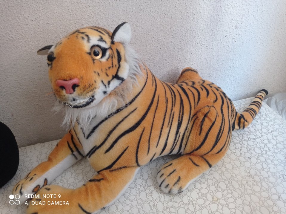 Detaylı çizgileri ve yumuşak dokusuyla renkli kahverengi kaplan peluş oyuncak.