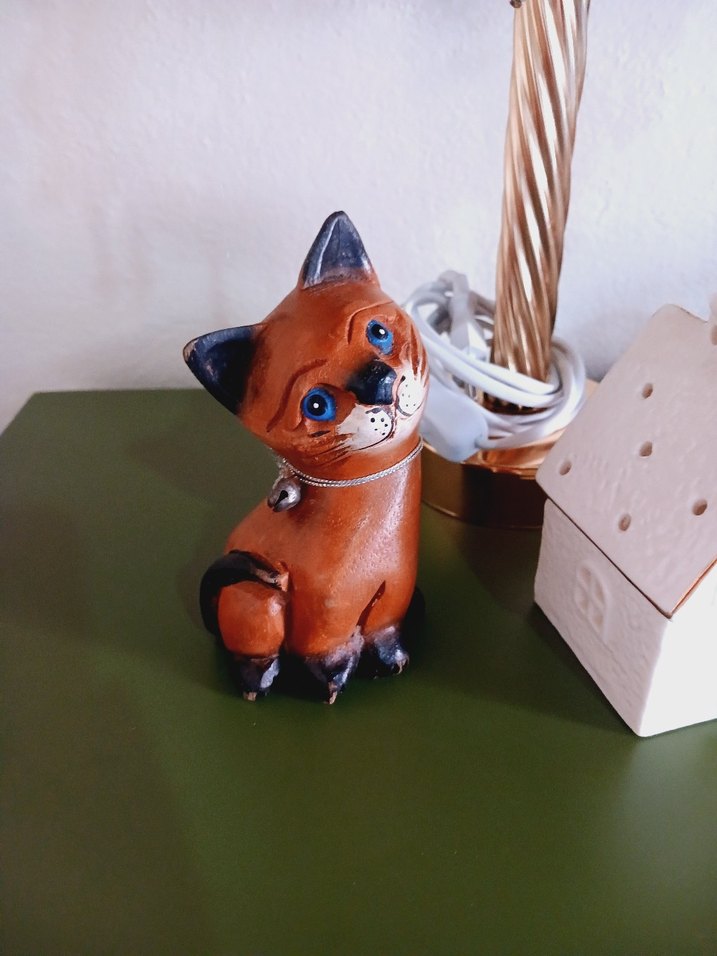 Renkli kahverengi kedi biblosu, ayrıntılı yüz ifadeleri ve küçük zil tasmasıyla dekorasyona sevimlilik katar.