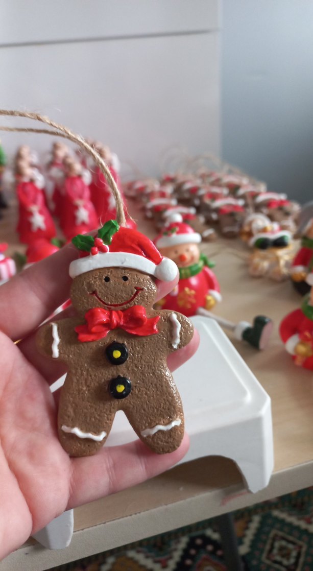Renkli kahverengi kurabiye adam figürin, Noel şapkası ve detaylı süslemelerle tasarlanmıştır.
