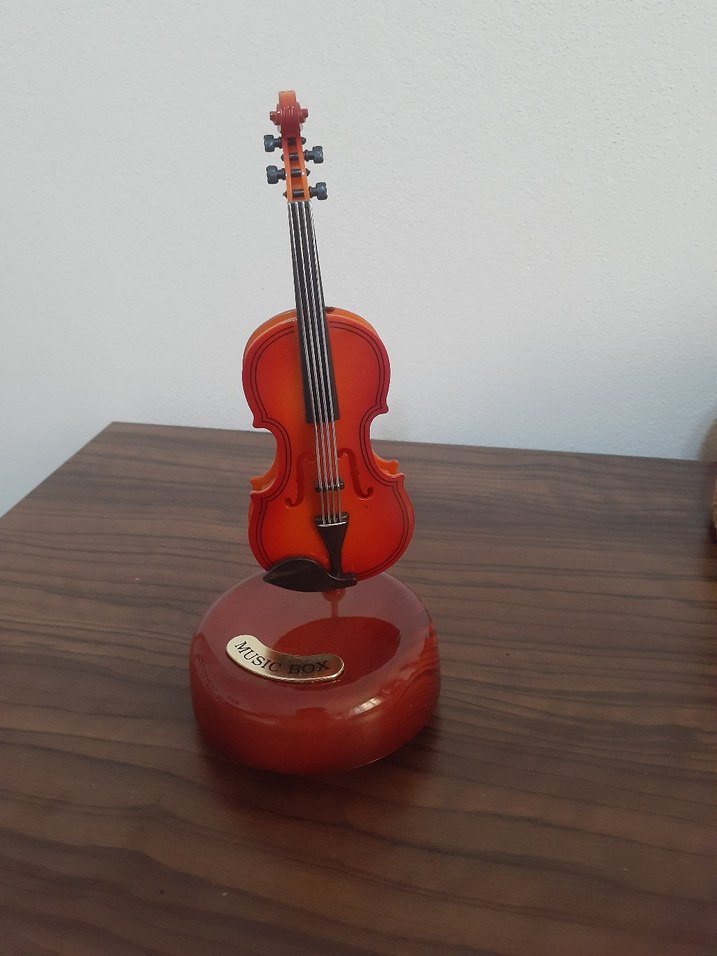 Kahverengi tabanlı renkli mini keman dekoru, müzik tutkunları için şık bir aksesuar.
