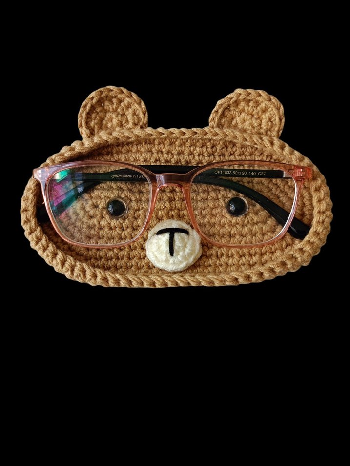 Kahverengi örgüden yapılmış, ayı yüzü şeklinde gözlük tutucu kedi aksesuarı. Renkli ve sevimli tasarım.