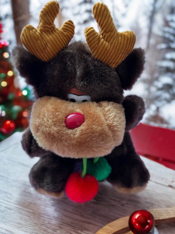 Yumuşak boynuzları ve kırmızı burnu olan renkli kahverengi peluş geyik oyuncak, kırmızı kiraz tutuyor. Konforlu ve tüylü dokusu var.