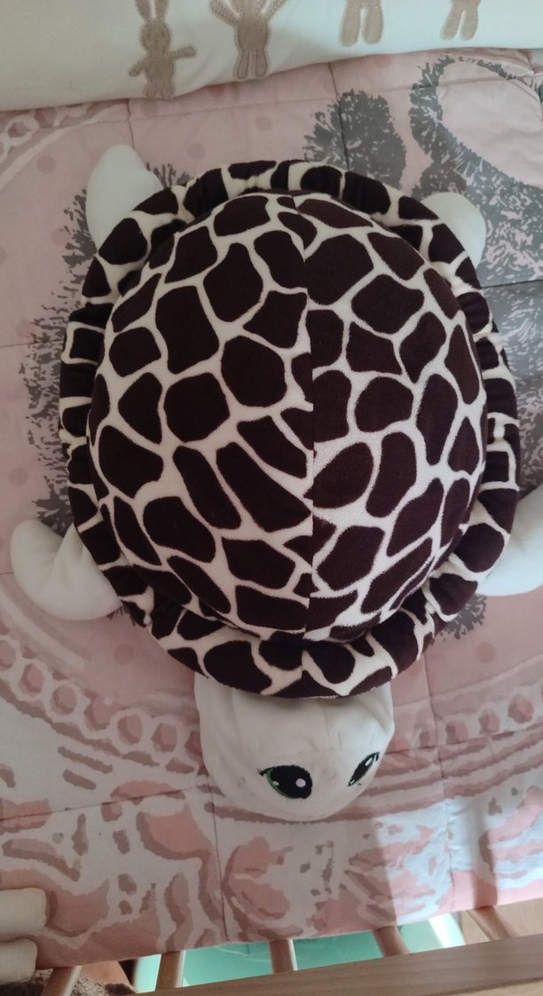 Renkli desenlere sahip yumuşak kahverengi peluş kaplumbağa oyuncak, sevimli yüzüyle sarılmaya uygun.