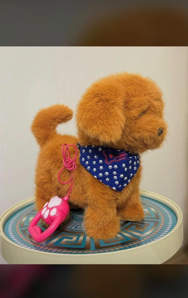 Yumuşak tüylü kahverengi peluş köpek oyuncak, mavi pati desenli bandana ve pembe pati şeklinde aksesuar içerir.