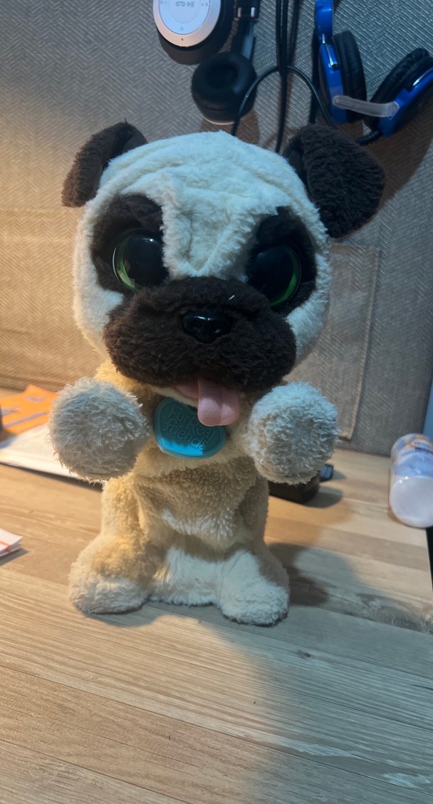 Bu peluş oyuncak, büyük gözleri ve yumuşak dokusuyla renkli kahverengi bir köpektir.