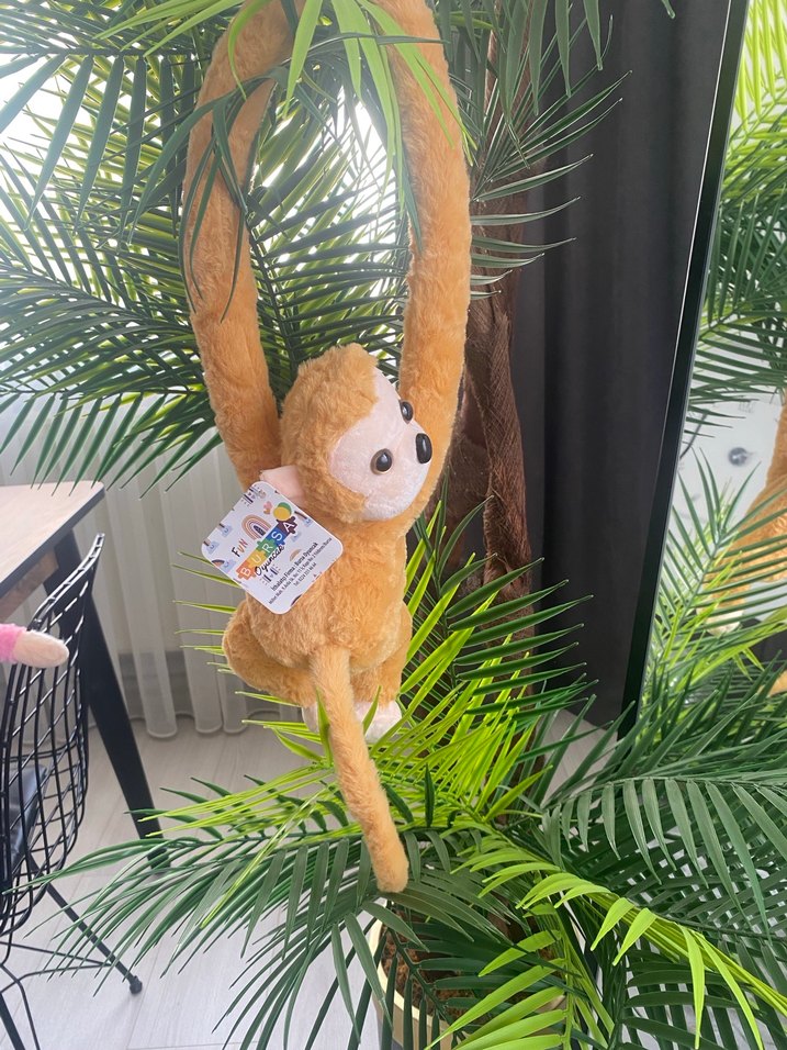 Uzun kollarıyla asılabilen renkli kahverengi peluş maymun oyuncak, yumuşak ve sevimlidir. Seslidir