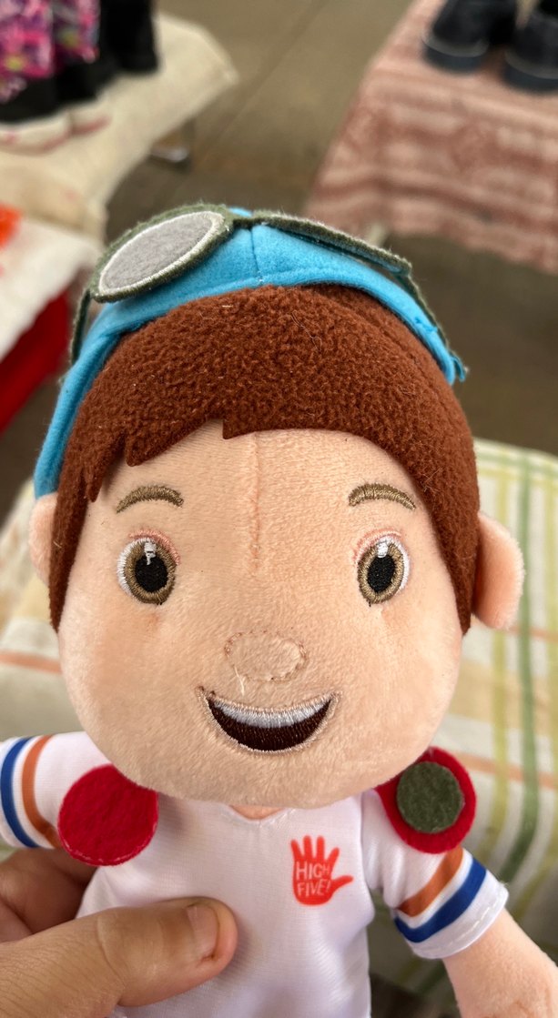 Renkli kahverengi peluş oyuncak, gülen yüzü ve gözlükleri olan mavi pilot şapkası ile yumuşak ve sarılabilir.