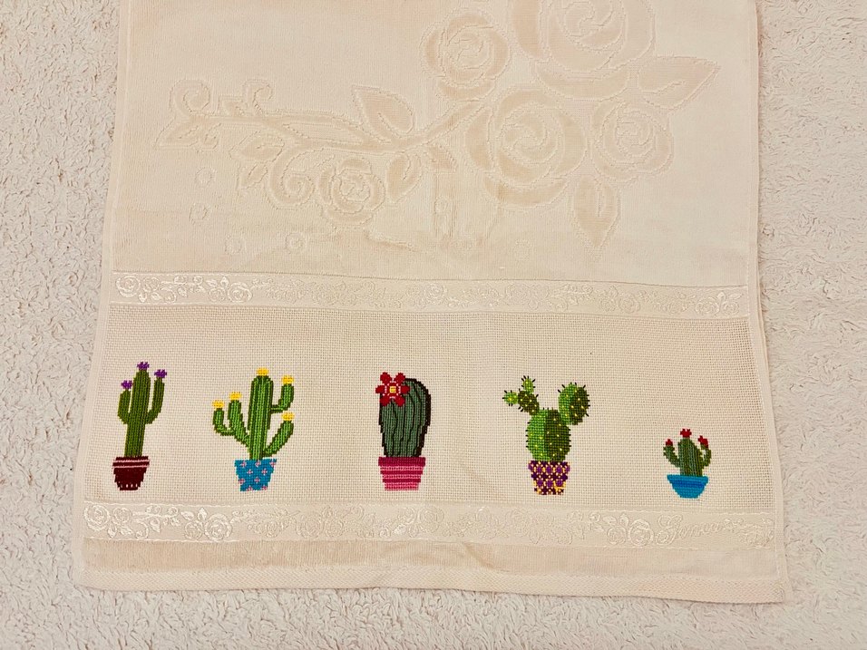 Hafif renkte, çok renkli kaktüs nakışlarıyla süslenmiş havlu. En:49 cm, boy:91 cm’dir.