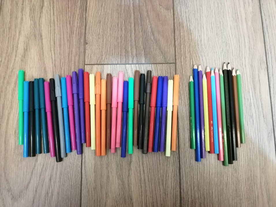 Çeşitli renkte kalem ve boya kalemlerinden oluşan renkli set. Çizim ve yazı için uygundur. ✏️Keçeliler hiç kullanılmadı,tahta faber castelller de çok az kullanıldı