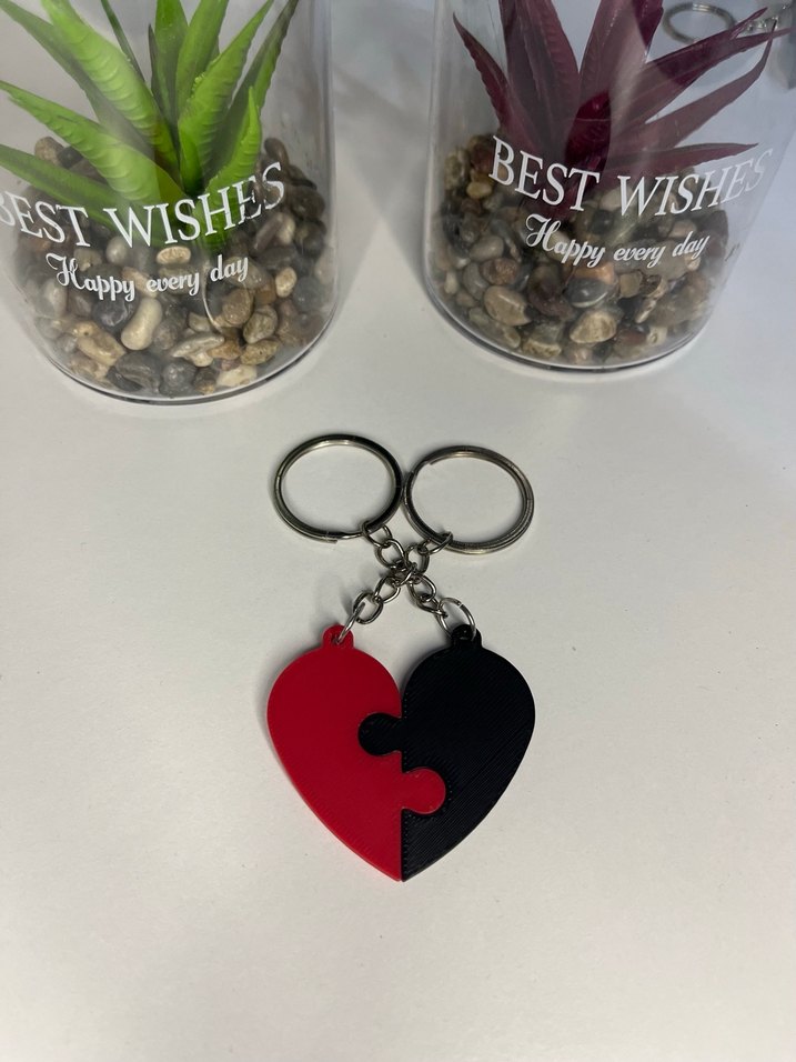 Zincir detaylı, kırmızı-siyah iki parçalı kalp tasarımlı renkli anahtarlık.