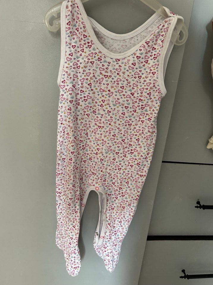 Beyaz bebek tulumu, renkli kalp desenleri ve ince dantel detaylarıyla yumuşak kumaştan üretilmiştir.
