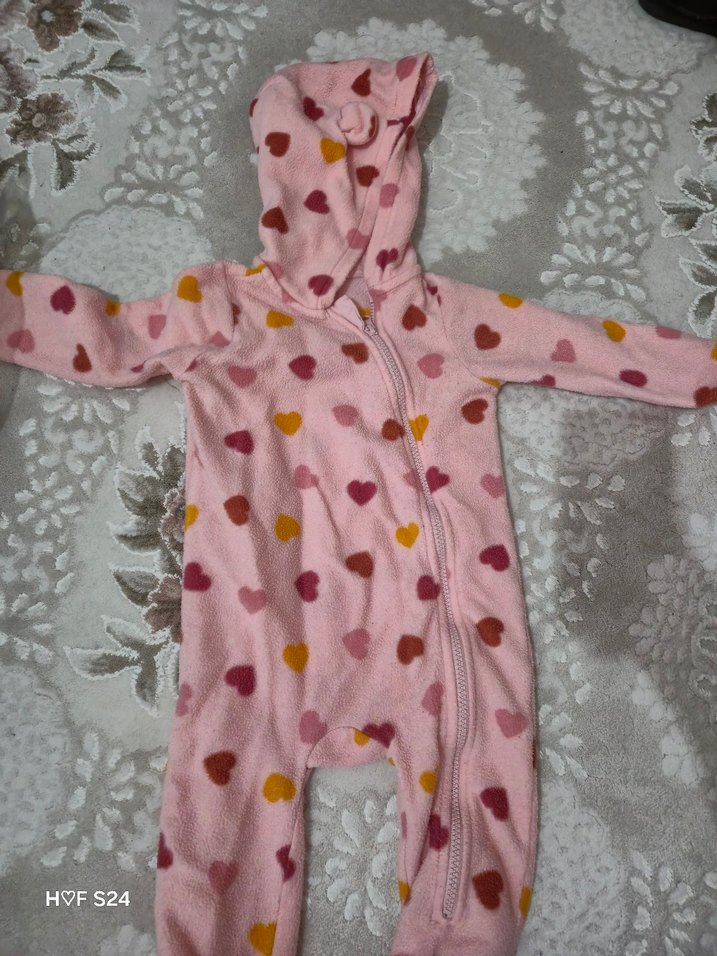 Renkli kalp desenleriyle süslenmiş fermuarlı ve kapüşonlu bebek tulumu. Yumuşak ve rahat kumaş, kodu HVFS24. 9.12 aylık