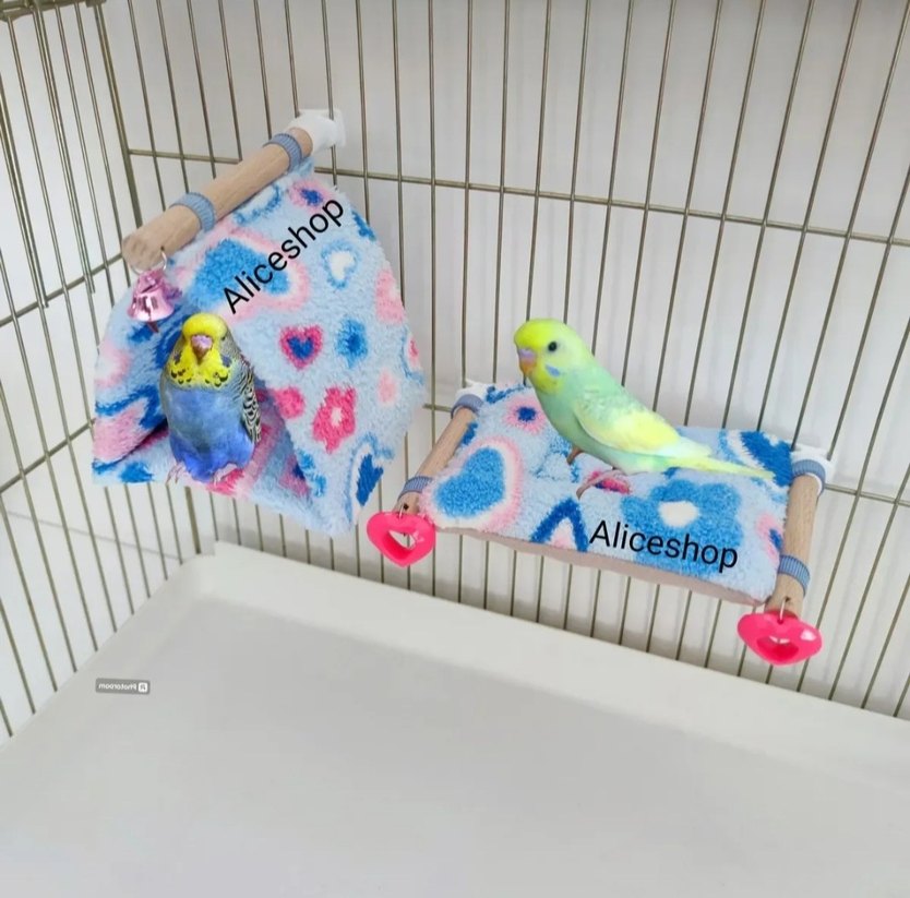 Pastel renkli kalp desenli kuş oyun salıncakları ve çadırı küçük kuşlar için yumuşak dinlenme ve oyun alanı sunar. Ahşap çubuklu ve askılıdır.