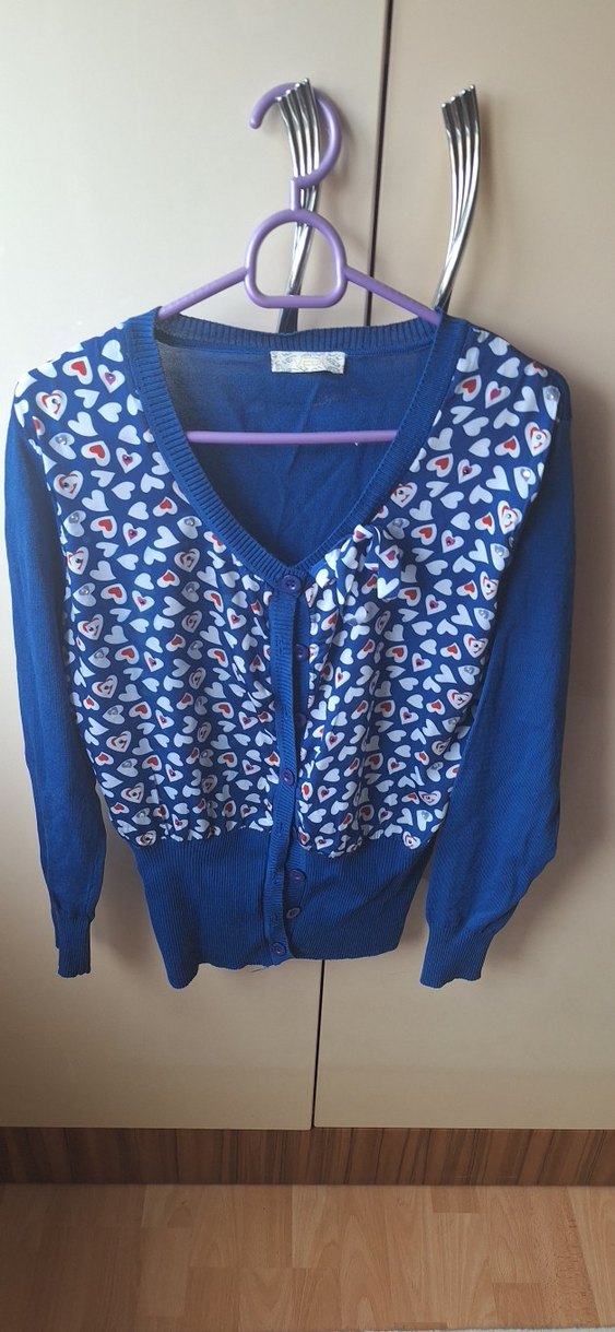 Renkli Kalp Desenli Mavi Kadın Hırka