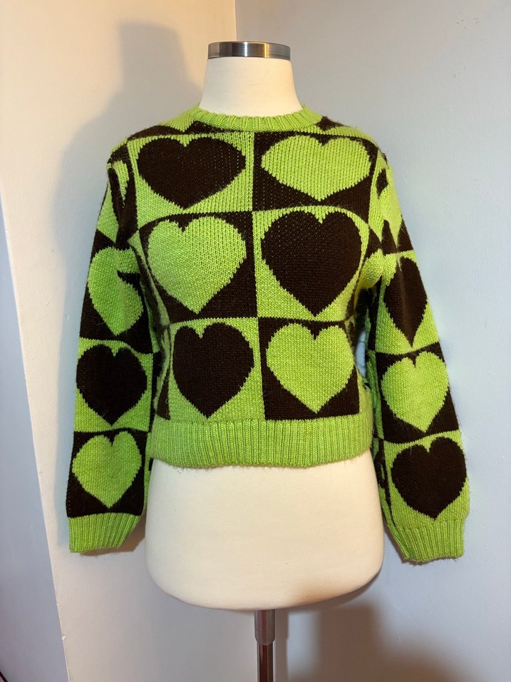 Rahat kesim, uzun kollu, yuvarlak yakalı kadın kazak. Renkli kalp desenleriyle örülmüş, rahat ve günlük kullanıma uygun. Xs-s beden için uygundur