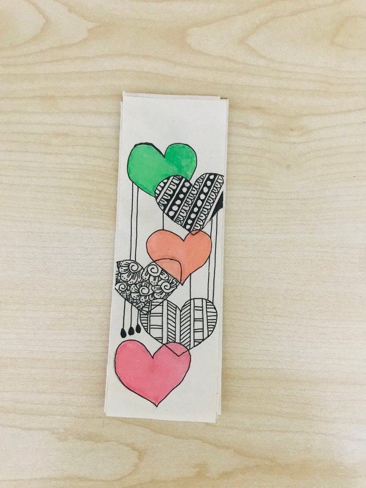 Çeşitli desenlere sahip renkli kalplerin yer aldığı sanat kitap ayracı.