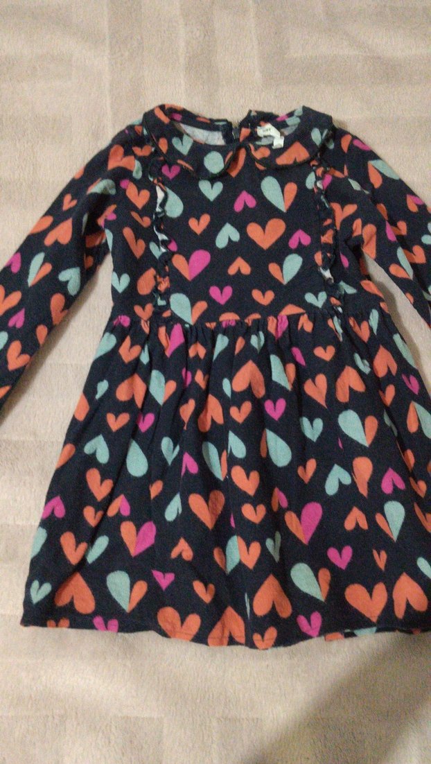 Uzun kollu, V yakalı ve bol kesimli kız elbisesi. Yumuşak sentetik kumaştan yapılmış, renkli kalp desenli ve fırfırlı detaylara sahip bohem tarzda.