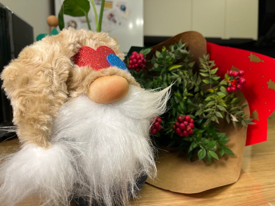 Yumuşak beyaz sakallı ve kırmızı-mavi kalp detaylı şapkalı, renkli cüce figür. Mekâna eğlenceli bir dokunuş katıyor. ♂️