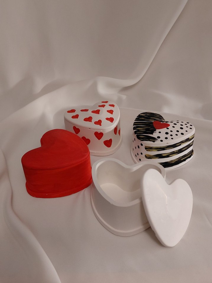 Kalp şeklinde, beyaz ve renkli desenlere sahip takı kutuları. Küçük eşyalar ve takılar için uygundur. ❤️