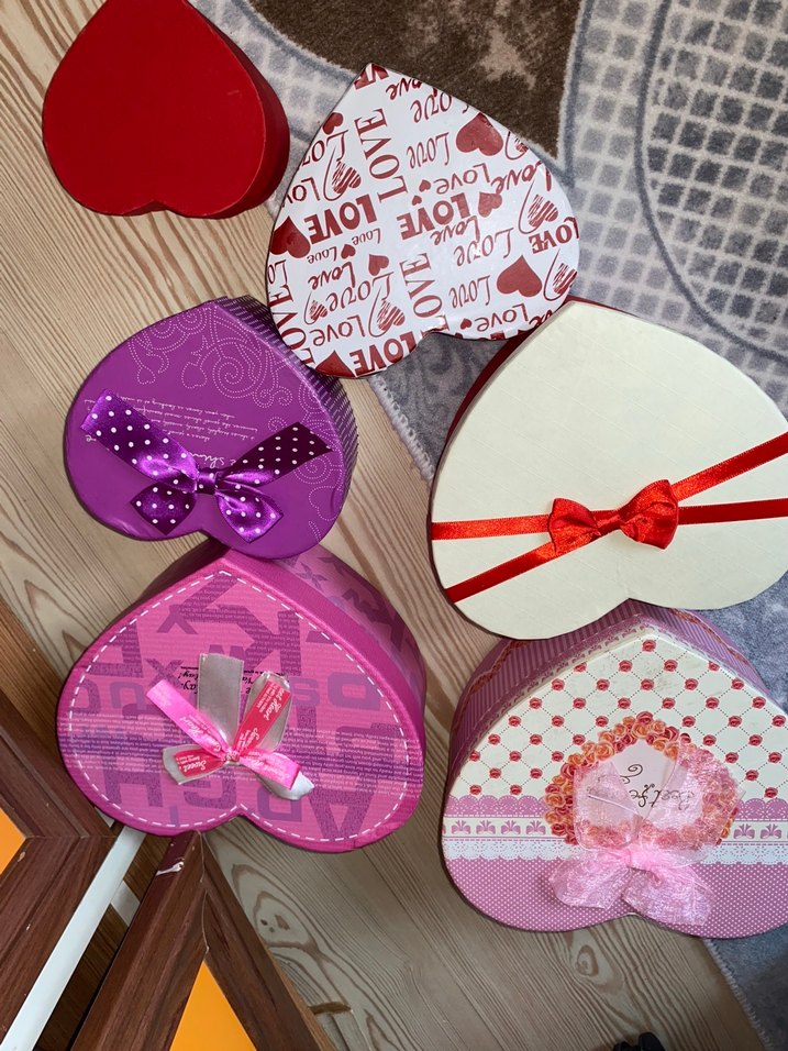 Farklı pembe ve kırmızı tonlarda, kurdele ve desenlerle süslenmiş renkli kalp şeklinde hediye kutuları seti. Fiyatlarını sorun