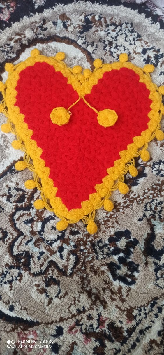 Sarı ponpon süslemeli, renkli kalp şeklinde banyo süngeri, nazik temizlik için uygun.