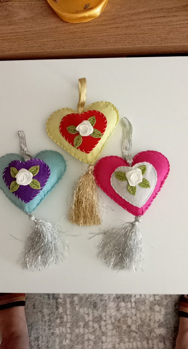 Keçe kumaştan yapılmış, küçük kumaş gülleri ve yapraklarla süslenmiş, parlak püsküllü renkli kalp şeklinde bohem süsler. Tane istenirse 80 lira.