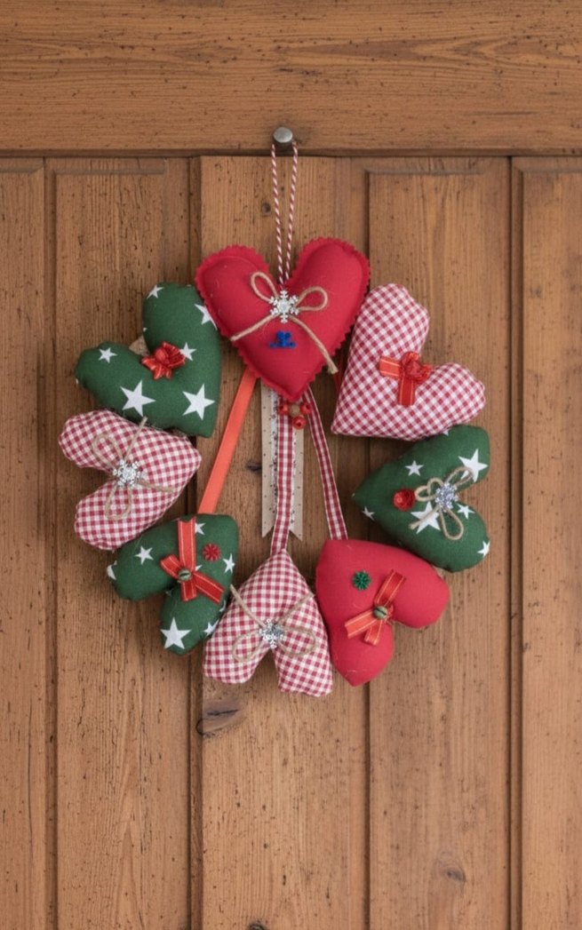Kırmızı, yeşil ve kareli desenlerde kalp şeklinde kumaş parçalarından oluşan, küçük fiyonk ve süslemelerle detaylandırılmış renkli kapı süsü. ❤️