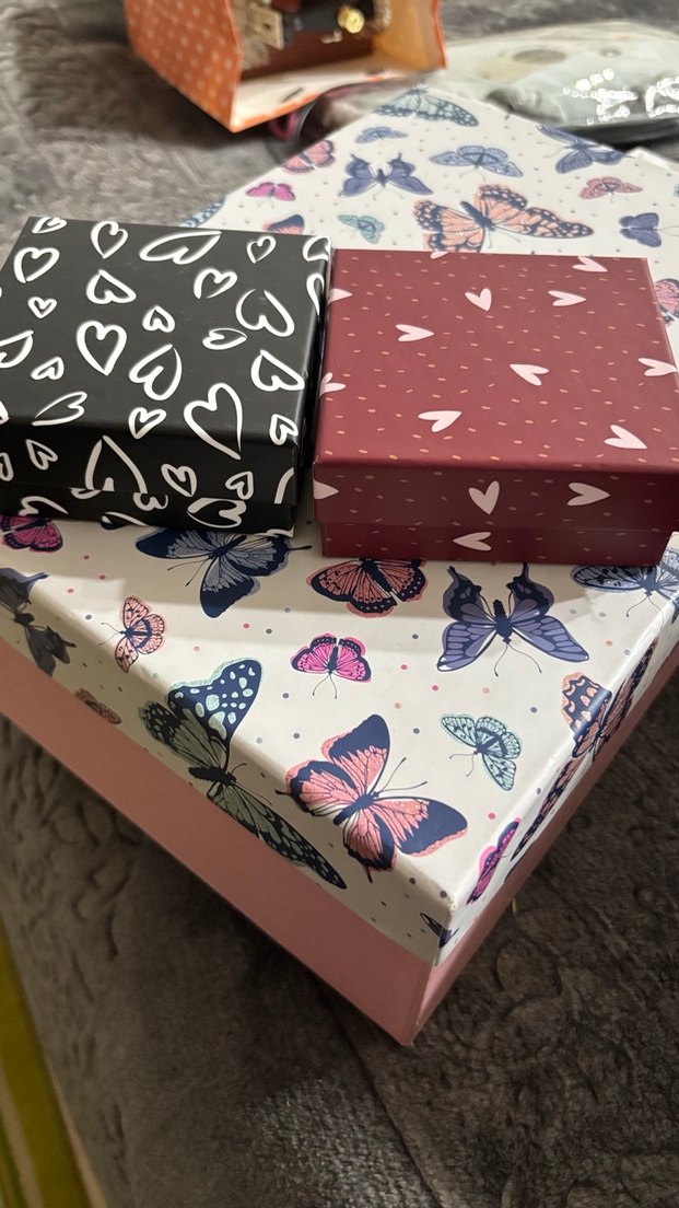Farklı boyutlarda, kalp ve kelebek desenli renkli hediye kutuları. Hediye sunumunda şık ve sevimli bir seçenek. Fiyat için yazın