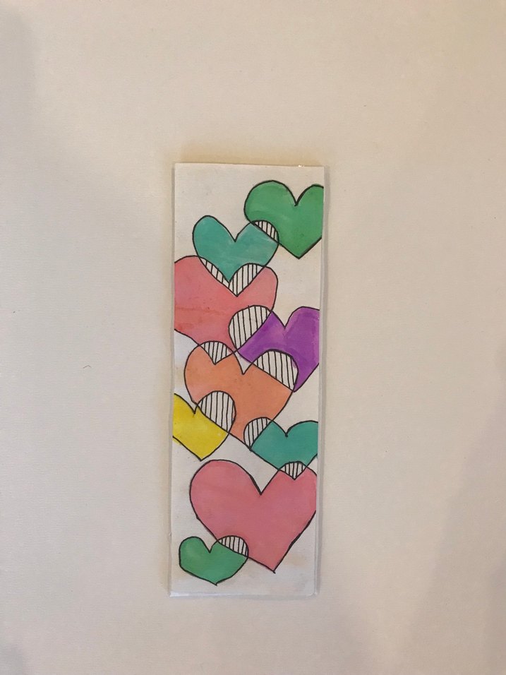 Beyaz zemin üzerinde çeşitli renklerde kalp tasarımları bulunan kitap ayracı. Sanat kitaplarınızda sayfa işaretlemek için uygun. ❤️