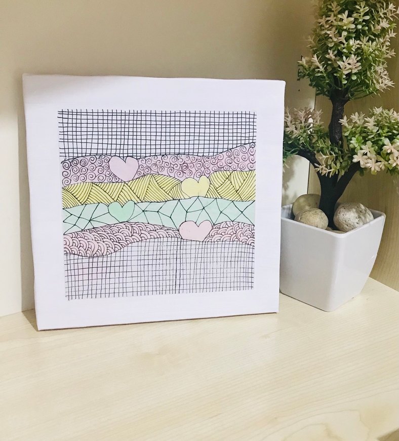 Renkli kalp desenleri ve soyut çizgilerle süslenmiş dekoratif tablo, mekana yumuşak bir dokunuş katıyor.