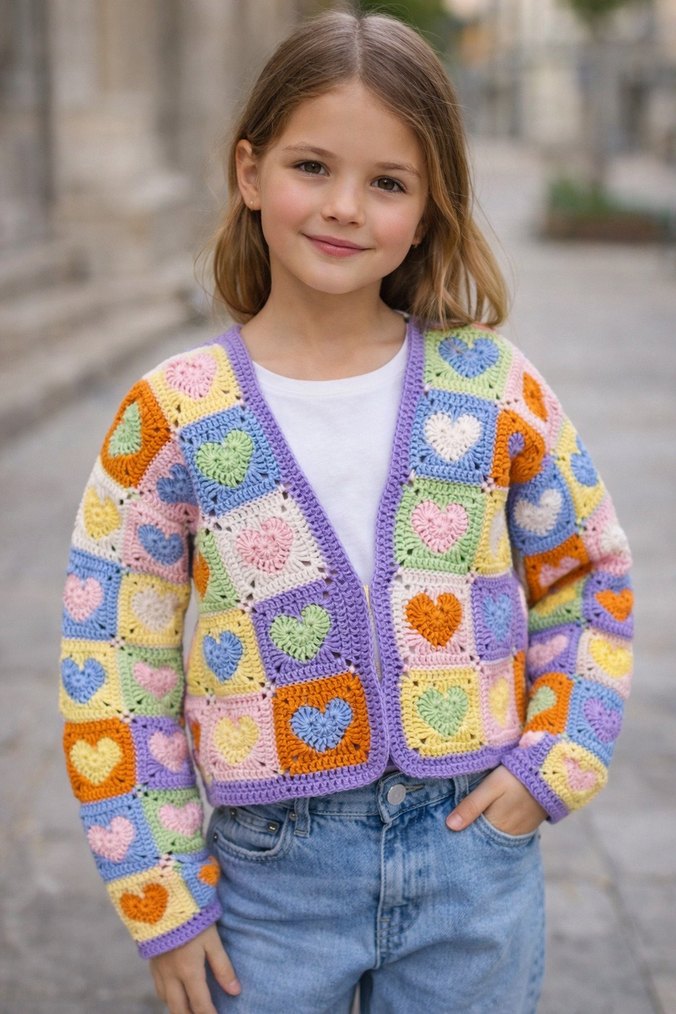 El örgüsü uzun kollu, pastel renklerde çok renkli nakışlı kalp desenli örgü hırka. Xs bedene tam olur çocuk içinde 12/13 yaşa uygun #handmade