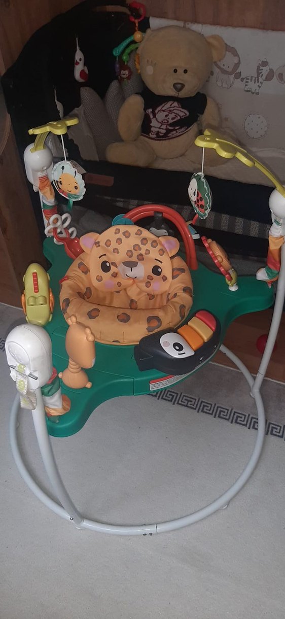 Renkli ve kamuflaj desenli kamel renkli oturma yeri olan, oyuncaklarla donatılmış bebek yürüteci. Dayanıklı çerçeve ve eğlenceli oyun unsurları içerir. Herhangi bir eksik parçası yada kırığı yoktur gayet sağlam durumda.