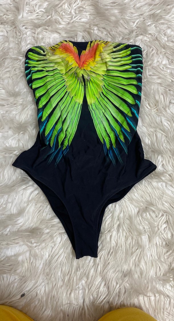 Renkli kanat desenli, kürklü detaylı, kolu olmayan ve vücuda oturan kadın mayo. Midi boyda, parti için uygun avant-garde tarzı.